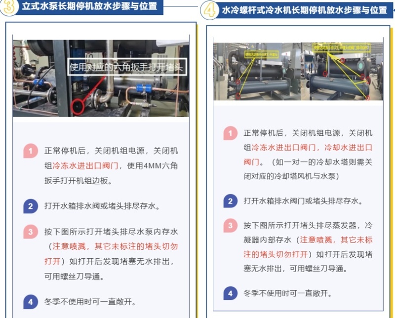 尊敬的客戶您好!強寒潮來臨我司溫馨提示:為了避免低溫環(huán)境導致設備損壞,需要對設備及時進行排水。如冷水機組、管道、水泵、冷卻塔及末端,當機組所處環(huán)境溫度低于零度時,機組停機后一定要盡快把水排盡存放,避免造成凍裂。